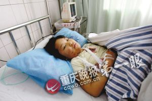 昨下午,8歲小女孩段雨昕躺在病床上。她說,由于昨日是舅爺?shù)?0歲大壽,她和爸爸媽媽回蓬溪縣老家赴宴。早上7點過,一家三口在觀音橋附近上車。車禍導致她右手骨折,臉頰部分擦傷。同在病房的爸爸段伯成頭部右側挫傷,半邊臉浮腫,一直不能進食,連說話都很困難。媽媽鄒彩蓮肝臟嚴重受損,目前一直在監(jiān)護室接受觀察。