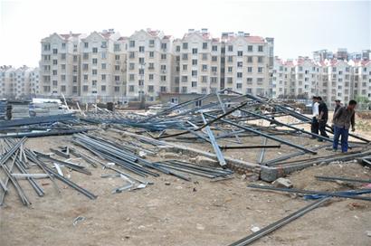 ????記者聞訊趕到現(xiàn)場看到,坍塌的位置在工地旁邊的一大片空地上,地上散落著大片兩三米長的藍色鋼架,其中大部分鋼架堆積在一起,鋼架旁邊堆著很多鐵皮板,周圍有幾名工人正在想辦法整理這些鋼架。一名工人告訴記者,這些鋼架實際上是兩層活動板房的“骨架”,支起“骨架”后再安裝上鐵皮板就可以很快搭起活動板房,供建筑工生活休息。但這些鋼架沒有支撐好,自北向南突然傾斜倒塌。記者詳細詢問鋼架坍塌的原因,這些工人突然警覺閉口不談,得知記者身份后接著撥打電話聯(lián)系一輛面包車離開現(xiàn)場。
