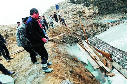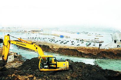 ????“讓挖掘機(jī)把附近企業(yè)的圍墻推倒,利用石塊將污水口堵住。”隨著現(xiàn)場(chǎng)指揮人員發(fā)令,一輛挖掘機(jī)將工地附近的圍墻推倒,其他兩輛挖掘機(jī)將石塊投入污水口。昨日上午10時(shí)許,經(jīng)過(guò)緊張的部署和搶險(xiǎn),倒灌的排污口終于被成功堵住。