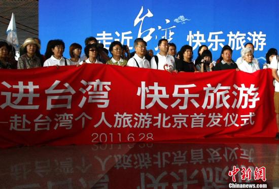 6月28日,兩岸民眾翹首企盼的大陸居民赴臺個人游正式啟動。290名首批幸運兒于當日分別自北京、上海、廈門出發(fā)奔赴寶島。國家旅游局、國臺辦、北京市旅游局、臺旅會等部門在首都機場為首日首批赴臺游客舉行了簡短的歡送儀式。中新社發(fā) 富田 攝
