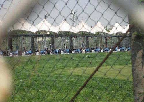 從南門(mén)進(jìn)入公園,一個(gè)高爾夫球手揮桿的雕塑矗立在記者眼前,道路兩側(cè)各有一處圈起來(lái)的綠地,周?chē)歉叽蟮膰W(wǎng),這就是網(wǎng)民所反映的高爾夫球訓(xùn)練場(chǎng)。在路西一側(cè)的訓(xùn)練場(chǎng)上,記者看到十幾個(gè)人正在練習(xí)高爾夫球。