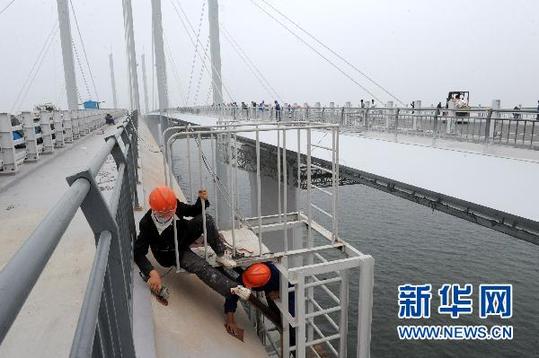 6月24日,工人在對大橋進行最后的橋面清理。 新華社記者 李紫恒 攝