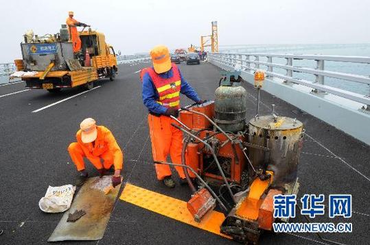 6月24日,工人在橋面上鋪設標識線。 新華社記者 李紫恒 攝
