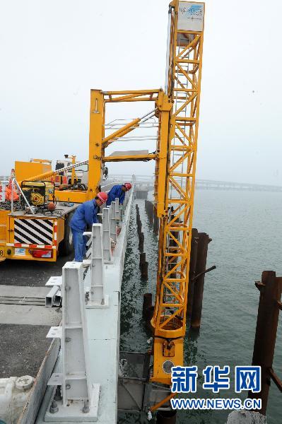 ????5日12時許,記者來到膠州灣大橋,橋上車輛來往不斷。記者從大橋青島端一路仔細查看,直抵紅島端。大橋護欄由立柱和橫欄組成,立柱每兩米左右有一個,橫欄共有三列,總高約1.5米。立柱均已由防腐蝕螺栓固定在橋身上。絕大多數橫欄已經固定在立柱上:只有距離青島收費口不遠處,有兩處總長十五六米的缺口,工人還在安裝橫欄。橫欄每根長五六米,銜接處用螺絲固定。橫欄銜接處,絕大多數已經掛上螺絲,但僅有少數被擰緊,記者用手即可將其旋開。