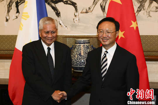 中新社北京7月8日電(記者郭金超) 中國外交部長楊潔篪8日同來訪的菲律賓外長德爾羅薩里奧在北京舉行會談。雙方就當前南海局勢交換了意見,強調(diào)兩國將根據(jù)中國與東盟國家簽署的《南海各方行為宣言》精神,共同致力于維護南海地區(qū)和平與穩(wěn)定。