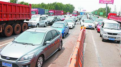 ????駛出收費(fèi)站的轎車(chē),前行大約30米后又被堵在了前方紅綠燈交叉道路上。記者大致算了一下,駛出紅綠燈大約用了20分鐘,此后,一路暢通,再也沒(méi)有出現(xiàn)堵車(chē)的現(xiàn)象。