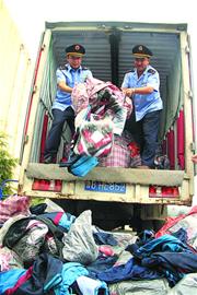 “打擊假冒偽劣,凈化市場環(huán)境”、“青島市工商局銷毀假冒偽劣物資專用車”……昨天上午,兩輛張貼著打假標語的廂式貨車拉著滿滿兩車廂假冒服裝,一路從市區(qū)開到位于萊西市姜山鎮(zhèn)的青島新天地固體廢物綜合處置有限公司,一路上引起不少市民關注。