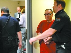 加拿大當(dāng)?shù)貢r(shí)間7月20日下午,賴昌星身穿囚服、戴著手銬。黃運(yùn)榮 攝
