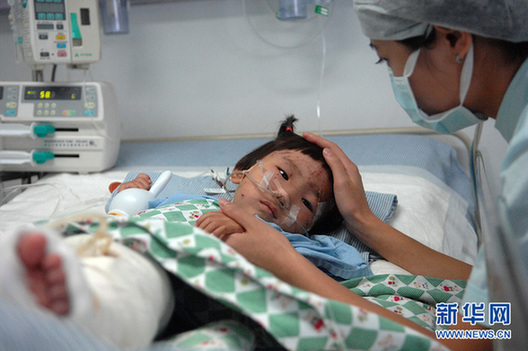????7月25日,護(hù)士在病床邊對項(xiàng)煒伊進(jìn)行心理安撫。當(dāng)日,“7·23”甬溫線動車追尾事故的最后一名獲救者、年僅兩歲零八個月的小女孩項(xiàng)煒伊在溫州醫(yī)學(xué)院附屬第二醫(yī)院重癥監(jiān)護(hù)室內(nèi)接受治療觀察。據(jù)醫(yī)生介紹,項(xiàng)煒伊的生命體征良好,但肺部、肝部及全身多處軟組織挫傷,左下肢兩個腳趾供血不足,院方將在觀察其下肢血液循環(huán)的恢復(fù)情況后再決定是否需要截肢。 7月23日20時38分,甬溫線北京南至福州D301次列車與杭州至福州南D3115次列車發(fā)生追尾事故。截至24日18時,該起事故中受傷人數(shù)上升到211人,死亡人數(shù)為35人。新華社記者黃宗治 攝