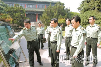 資料圖:南京軍區(qū)檔案館館長(zhǎng)朱蒙生(左)向軍區(qū)參謀長(zhǎng)蔡英挺(中)、軍區(qū)司令部辦公室主任方要紅(右)介紹軍區(qū)檔案館改造方案。