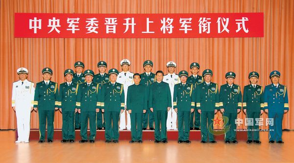 2007年11月2日,中央軍委在北京八一大樓隆重舉行晉升上將軍銜儀式。中央軍委主席胡錦濤向晉升上將軍銜的中央軍委委員、總裝備部部長(zhǎng)常萬(wàn)全頒發(fā)命令狀。這是晉銜儀式結(jié)束后,胡錦濤等領(lǐng)導(dǎo)同志與常萬(wàn)全合影留念。本報(bào)記者周朝榮攝