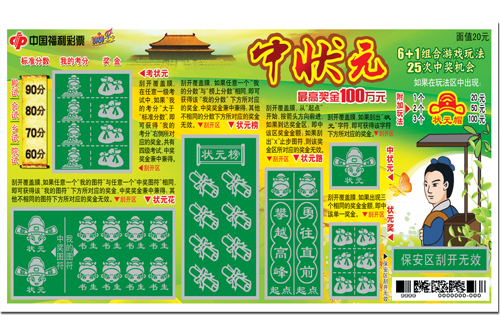 ????中狀元:刮開覆蓋膜,如果刮出“狀元”字符,即可獲得該字符下方所對應(yīng)的獎金。