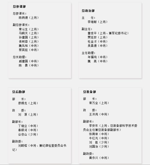 另外,原成都軍區(qū)政治部主任吳昌德中將出任總政治部副主任,原國防科技大學校長張育林中將、擁有中科院院士頭銜的劉國治少將出任總裝備部副部長,原蘭州軍區(qū)副政委劉曉榕中將任總后勤部副政委、紀委書記。