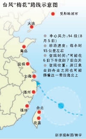 本報(bào)訊(記者金煜)今年最強(qiáng)臺(tái)風(fēng)“梅花”可能于今天夜間到明天白天在浙江臺(tái)州到江蘇啟東一帶沿海登陸,也可能擦著這一帶沿海北上,影響山東和華北東部,威力將波及十余個(gè)省市區(qū)。昨日,中國(guó)氣象局發(fā)布臺(tái)風(fēng)橙色預(yù)警。
