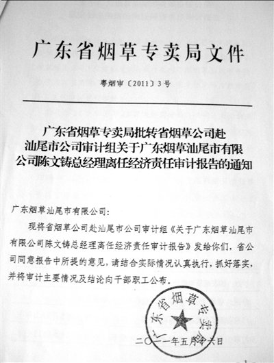 對廣東省汕尾市煙草局長陳文鑄的調查始于2010年10月。當時,一批被解聘的煙草職工實名舉報陳文鑄涉嫌多項腐敗,相關內容的網(wǎng)帖被紛紛轉載。迫于輿論壓力,省煙草局人事勞資處成立調查組。2010年11月2日,這個調查組發(fā)給汕尾市委宣傳部的調查情況稱,“據(jù)初步調查,上述職工反映的情況基本失實”。