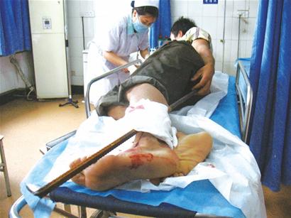 青島某工地,鋼筋扎穿工人腿