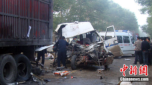 經(jīng)當(dāng)?shù)鼐匠醪娇辈欤?月28日5時(shí)10分許,尚義縣南壕塹鎮(zhèn)西平山村班定營(yíng)子自然村岳建兵駕駛白色依維柯載有34人沿401縣道由南向北行駛從尚義縣城到大青溝鎮(zhèn),行駛到三義店村北路段時(shí),與前方順行停在路右側(cè)的張家口市宣化區(qū)龐家堡鎮(zhèn)花家良村花智勇駕駛的匯達(dá)牌重型半掛車(chē)(冀GN281掛)發(fā)生追尾,造成當(dāng)場(chǎng)死亡17人、受傷17人(其中1人因搶救無(wú)效于12時(shí)10分死亡),兩車(chē)嚴(yán)重受損重大交通事故。