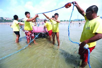 昨天上午11時許,記者來到第一海水浴場,此時,浴場的救生隊員已經將備用防鯊網取出,經過晾曬之后,開始對防鯊網進行安裝。雖然此時正值落潮,給安裝防鯊網提供了方便,但海上的風浪依然不小,深水區(qū)防鯊網的安裝有一定的難度。只見八名救生隊員把已經選好的防鯊網放到小船中,推著船朝防鯊網原先位置的浮標繩走去。到達原浮標繩位置之后,兩名救生隊員負責將新浮標繩與原有的浮標繩固定在一起,其他救生隊員則負責撐網。