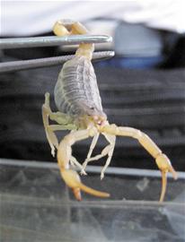 動(dòng)植物專家介紹,被蝎子蜇傷后會(huì)產(chǎn)生大片紅腫、劇痛,輕者幾天后癥狀消失,嚴(yán)重者可因呼吸、循環(huán)衰竭而死亡。醫(yī)生提醒廣大市民,一旦被蝎子蜇傷千萬(wàn)莫著急,可先用繩子將受傷部位附近扎起,再用小刀片割出一個(gè)半厘米的十字口放出被蜇部位的血液,隨后用蘇打、肥皂等堿性溶液沖洗傷處,并及時(shí)前往醫(yī)院就醫(yī)。