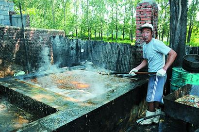 “真是太驚人了!”昨天上午11時許,正當(dāng)執(zhí)法人員進入窩點檢查時,兩名送雞肛下腳料和泔水原料的工人開著運輸車正要離開,被民警攔住帶回了煉油點。記者在煉油點看到,一個約有上千平方米的院子緊挨著一條小河,在院子里堆滿了大油桶,里面已經(jīng)裝滿了提煉后的“成品油”。在院子另一側(cè),幾名工人正在兩口大鍋旁煉油。記者和執(zhí)法人員還沒等靠近,就被一股說香不香,說臭不臭的刺鼻怪味熏的差點嘔吐。
