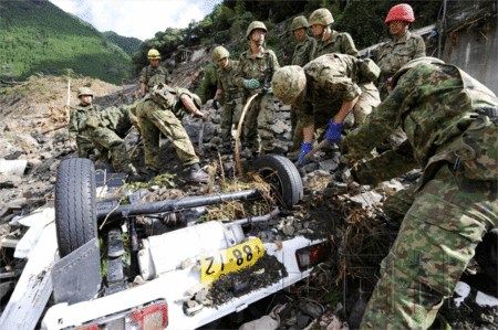 日本自衛(wèi)隊(duì)員將埋在泥沙中的車(chē)輛挖出以尋找失蹤人員。6日上午9時(shí)08分?jǐn)z于奈良縣五條市大塔町宇井地區(qū)。(共同社)