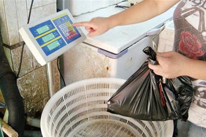 記者隨后又買了一份活蝦虎,托盤秤上的秤盤還有些水??吹接浾叨⒅斜P秤,女商販趕緊把秤盤里的水倒掉了。此前可能是看到記者掏出電子彈簧秤來復(fù)秤,這份蝦虎夠秤了,不過依舊沒有去掉塑料袋子的皮重。在買了兩份海鮮后,記者特意單獨(dú)稱了稱鱽魚商販給的塑料袋,一個袋子35克,光是一個袋子商販就多賺了1.96元。
