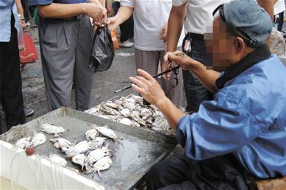 記者來(lái)到一個(gè)賣偏口魚(yú)的攤位處,該攤主使用的是一臺(tái)托盤秤,秤盤上的指針沒(méi)有指到零刻度上,一位老太太剛買了兩斤魚(yú),感覺(jué)分量不夠秤,掏出自帶的一個(gè)彈簧秤來(lái)復(fù)秤,果然少了斤兩?!澳憧纯丛趺床粔虺樱俊崩咸?dāng)場(chǎng)找商販,商販趕緊掏了一條魚(yú)塞到老人的塑料袋子里。