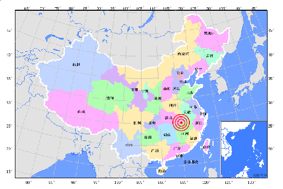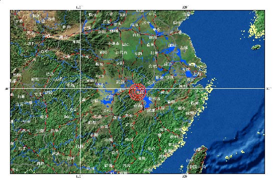 中新網(wǎng)9月10日電 據(jù)中國地震臺(tái)網(wǎng)測(cè)定,北京時(shí)間2011年9月10日23時(shí)20分在江西省九江市瑞昌市、湖北省黃石市陽新縣交界地區(qū)(北緯29.7,東經(jīng)115.4)發(fā)生4.6級(jí)地震, 震源深度17公里。武漢、南昌等地均有震感。
