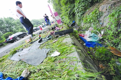 “你看,這些都是乘客及大客車上遺留下的東西,實(shí)在太慘了。”現(xiàn)場(chǎng)一名工作人員告訴記者,油污及雜物被清理至旁邊的路溝中。記者在雜物里看到,十幾只各類鞋子粘著油污,橫七豎八地丟在地上。一捆捆的印有某某超市的塑料手提袋,隨處可見,可能是隨車帶的貨物。而手機(jī)蓋、香煙盒、毛巾、衣服等伴著大客車被撞的零部件,堆出一條長(zhǎng)長(zhǎng)的埂道,邊走邊看,步步驚心。