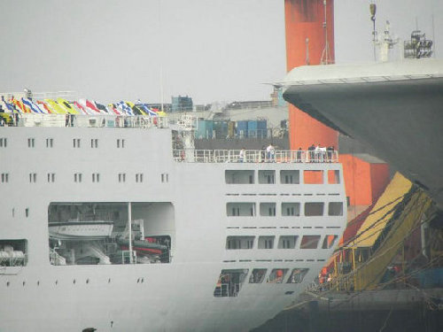 資料圖:??吭诖筮B的瓦良格航母。