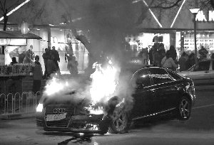去年12月17日晚,被王爍倒車撞壞的王珂軍牌奧迪在馬路上起火燃燒。