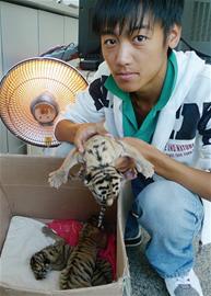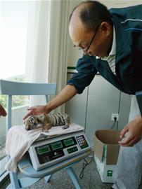 青島森林野生動(dòng)物世界一只7歲的東北虎產(chǎn)下三胞胎 ? 新聞提示 8月21日,青島動(dòng)物園的11歲母虎產(chǎn)下“三胞胎”,昨天,青島森林野生動(dòng)物世界又傳來消息,一只7歲的東北虎早晨6時(shí)也產(chǎn)下了“三胞胎”,短短一個(gè)月,我市的虎族喜添“6丁”。然后,令人著急的是,野生動(dòng)物世界的7歲東北虎因?yàn)榈谝淮萎?dāng)媽媽,缺乏帶崽經(jīng)驗(yàn),出現(xiàn)棄崽的情況。情況危急,工作人員及時(shí)把母虎與虎崽分離,施行人工喂養(yǎng)。工作人員告訴記者:“小虎崽,吃不到動(dòng)物初乳,會(huì)有生命危險(xiǎn),如果有市民家的寵物狗剛生崽,可當(dāng)小老虎臨時(shí)媽媽,幫它們渡過難關(guān)?!?/p> 喜 7歲虎媽產(chǎn)下三胞胎 最近一周來,森林野生動(dòng)物世界工作人員好不忙活,園區(qū)內(nèi)的7歲東北虎進(jìn)入預(yù)產(chǎn)期即將產(chǎn)崽,工作人員實(shí)行24小時(shí)監(jiān)控確保母虎安全生產(chǎn)。昨天凌晨,母虎產(chǎn)房傳出一陣嘈雜的聲音,到早晨6時(shí)左右,工作人員發(fā)現(xiàn)母虎作蹲體狀,產(chǎn)下了一只小老虎,隨后又產(chǎn)下一只??赡苁且?yàn)轶w力不支,這只母虎又躺了下來。工作人員此時(shí)看到,母虎用舌頭舔舐著兩只小老虎,兩只小老虎長(zhǎng)不過幾十厘米,如同小貓一般大。 上午8時(shí)左右,第三只小老虎順利產(chǎn)下后,母虎躺在產(chǎn)房?jī)?nèi)休息,但奇怪的是,這只母虎把3只幼崽棄在一邊不管不問??蓱z的3只小老虎嗷嗷待哺,卻吃不到“媽媽”的初乳。 急 暗語勸走母虎救虎崽 動(dòng)管部部長(zhǎng)張雙歌馬上意識(shí)到,這只母虎可能第一次產(chǎn)崽,缺乏帶崽經(jīng)驗(yàn),不會(huì)喂養(yǎng)孩子,如果長(zhǎng)時(shí)間這樣,3只小老虎生命不保?!鞍研』⑨瘫С龌\子,實(shí)行人工喂養(yǎng)?!睆堧p歌立即組織工作人員試圖將幼崽取出產(chǎn)房。老虎是猛獸,在生產(chǎn)后如果見到生人或者是受到驚嚇,有可能出現(xiàn)吃崽情況。 這怎么辦?此時(shí)張雙歌想到,這只母虎曾經(jīng)是表演虎,特別聽馴獸師的話,他找來馴獸師,由他用專門的暗語,把這只剛生產(chǎn)的虎媽媽勸到另外的籠子。果然這個(gè)辦法奏效,母虎聽到馴獸師的指令后,拖著疲憊的身體,到了另外籠子內(nèi)休息。工作人員趁機(jī)沖進(jìn)產(chǎn)房,把3只虎崽送到專門的育幼室。 樂 3只小老虎個(gè)個(gè)挺精神 因擔(dān)心剛出生的小老虎受涼,工作人員找來“熱太陽”,提高了育幼室的溫度,很快房間內(nèi)的溫度就達(dá)到了20多度。3只小老虎趴在紙箱內(nèi),簇?fù)碓谝黄?,相互取暖。工作人員根據(jù)以往的經(jīng)驗(yàn)判斷,剛出生的小老虎身體比較弱,需要補(bǔ)充葡萄糖,便把葡萄糖灌進(jìn)了奶瓶,喂給小老虎喝。不知道是因?yàn)闆]有吃上初乳的原因,還是受到驚嚇,小老虎們始終不肯張嘴喝葡萄糖。無奈,工作人員把小老虎捧在手中,輕輕敲開它的嘴巴,這才把葡萄糖喂到小老虎的嘴里。很快3只小老虎就喝下了半奶瓶葡萄糖。 工作人員稱了稱,這3只小老虎體重最重的兩斤,最輕的1斤左右,目前身體狀況良好。記者了解到,這些小老虎可是國(guó)寶級(jí)的動(dòng)物,他們將安排兩名工作人員24小時(shí)照看3只幼虎,按時(shí)給它們喂奶。 抱起百獸之王如同抱只小貓 體驗(yàn) 威猛的老虎,剛出生就如同一只可愛的小貓,完全看不到它兇狠的一面。都說老虎的屁股摸不得,但記者昨天有幸抱到了剛出生的小老虎。 記者洗手后,征得工作人員同意,輕輕抱起了其中一只小老虎,只見它的眼睛閉著,無法看清東西,四肢也沒有力氣?!皠e看它現(xiàn)在很弱小,一年后就是猛獸之王了?!睆堧p歌說。話剛說完,記者抱著的小老虎就掙扎起來,4只爪子伸開后露出了百獸之王的特性,原來它的爪子剛出生就能有一厘米長(zhǎng)。張雙歌告訴記者,10天后小老虎就能睜開眼睛。 小老虎的媽曾經(jīng)是明星 揭秘 張雙歌告訴記者,這3只小老虎的媽媽曾經(jīng)是個(gè) “明星”。據(jù)悉,現(xiàn)在森林野生動(dòng)物世界的猛獸區(qū)一共有5只老虎,一公四母。“這只剛當(dāng)媽媽的東北虎今年7歲了,以前在表演場(chǎng)內(nèi)生活,是表演明星,能夠表演很多精彩的節(jié)目,后來年齡大就退役了,在猛獸區(qū)內(nèi)安家?!?/p> 張雙歌說,這只東北虎剛進(jìn)入猛獸區(qū),就受到了10歲虎王的青睞,今年6月這只東北虎懷孕了,懷孕后食欲大增,每天能吃十五六斤肉,其中包括牛肉和雞肉,是平時(shí)飯量的一倍。 認(rèn)狗當(dāng)奶媽才能保安康 行動(dòng) 昨天下午,青島森林野生動(dòng)物世界動(dòng)管部部長(zhǎng)張雙歌告訴記者,目前剛當(dāng)虎媽媽的7歲東北虎身體狀況良好,在工作人員的努力下,3只小老虎已經(jīng)喝下了20毫升的特制牛奶?!皬哪壳皝砜矗±匣⒌纳鼤簳r(shí)保住了,但是猛獸剛出生后,必須要喝動(dòng)物的初乳,才能健康生活,否則隨時(shí)會(huì)有生命危險(xiǎn)?!睆堧p歌說,他們?cè)?jīng)遇到過類似的情況,比如出現(xiàn)獅子和狼棄崽情況,他們找來剛生產(chǎn)的寵物狗,幫幼獅和狼崽渡過了生命難關(guān)。 目前,森林野生動(dòng)物世界也在四處找剛生產(chǎn)的寵物狗,希望能讓它們代替老虎當(dāng)上臨時(shí)媽媽,照顧這些小老虎盡快成長(zhǎng)起來。市民如果有這方面的線索,可以撥打森林野