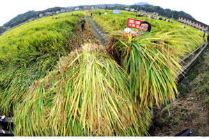 昨日,隆回縣國家雜交水稻研究中心羊古坳基地內(nèi),當?shù)剞r(nóng)民正在喜割成片的超級雜交水稻,由農(nóng)業(yè)部專家組組織的超級雜交稻畝產(chǎn)900公斤攻關(guān)項目驗收在這里進行。周柏平攝 沖刺畝產(chǎn)900公斤懸念待解(主) 農(nóng)業(yè)部專家組在隆回驗收超級稻大面積畝產(chǎn) 初步結(jié)果預(yù)計今天發(fā)布 袁隆平表示:攻破900公斤是邁向1000公斤的新起點 本報隆回訊(記者 李杜 通訊員 辛業(yè)蕓 彭既明)由雜交水稻之父袁隆平領(lǐng)軍的中國超級雜交稻“新銳力量”沖刺大面積畝產(chǎn)900公斤世界紀錄的大考,昨日在邵陽隆回縣羊古坳鄉(xiāng)如期舉行。由中國水稻研究所所長程式華研究員任組長的農(nóng)業(yè)部超級雜交稻驗收專家組,對羊古坳鄉(xiāng)雷鋒村107.9畝超級雜交中稻“Y兩優(yōu)2號”進行現(xiàn)場抽簽驗收,沖刺大面積畝產(chǎn)900公斤是否成功?初步結(jié)果預(yù)計今天發(fā)布。 畝產(chǎn)900公斤將創(chuàng)造雜交稻新記錄 據(jù)記者了解,由農(nóng)業(yè)部制定的中國超級稻育種的第三期目標是,同一生態(tài)區(qū)兩個點連續(xù)兩年百畝示范片產(chǎn)量達到每畝900公斤。 昨天,袁隆平一直在位于長沙的國家雜交水稻工程技術(shù)研究中心等待考試成績,期間,他除打電話向中心工作人員詢問當?shù)靥鞖鈱Φ咎锏挠绊?,沒有驚動任何專家。他告訴記者,搞科研不怕失敗,跌倒了爬起來接著干,攻破900公斤不是終點,而是邁向1000公斤的新起點。 眾所周知,盡管這次大考的最終成績尚未正式公布,以中國超級雜交稻研究與推廣每年大步跨越所取得的成績,中國超級雜交水稻研究再次超越自我、領(lǐng)跑世界毫無懸念。 每公頃增產(chǎn)2噸能多養(yǎng)活四五億人 袁隆平院士告訴記者,日本、國際水稻研究所都曾制定水稻高產(chǎn)育種計劃,并投入了大量人力和物力,從目前已掌握的情況來看,日本曾創(chuàng)下在4.5分的小面積土地上達到畝產(chǎn)800公斤的記錄。在中國云南永勝,由湖南雜交水稻研究中心專家選育的品種,曾在面積1畝多的土地上創(chuàng)下畝產(chǎn)1216公斤的超高產(chǎn)記錄。本月13日,由湖南省農(nóng)業(yè)廳組織的專家在懷化鶴城區(qū)石門鄉(xiāng)犀牛塘底村,對Y兩優(yōu)系另一品種進行現(xiàn)場測產(chǎn),驗收結(jié)果為:測產(chǎn)的2.01畝稻田,平均畝產(chǎn)959.23公斤。 全世界一半以上人口以稻米為主食,現(xiàn)在每公頃生產(chǎn)的稻米可養(yǎng)活27人,到2050年,每公頃必須養(yǎng)活43人。袁隆平告訴記者,中國雜交水稻在世界許多國家都適合種植,如果世界上雜交稻種植面積增加7500萬公頃,每公頃按增產(chǎn)2噸計算,可增產(chǎn)糧食1.5億噸,能多養(yǎng)活四五億人口,有效保障世界糧食安全。為幫助人類告別饑荒,中國科技人員已做好準備。 |