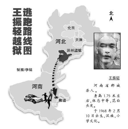 ????王振輕現(xiàn)年43歲,河南鄲城縣虎崗鄉(xiāng)王寨村人。去年5月底,王振輕伙同他人在河北藁城縣扒竊貨車,被河北警方抓獲歸案。今年1月,河北藁城縣法院以盜竊罪判處他有期徒刑10年。隨后,王振輕被羈押到深州監(jiān)獄服刑。9月11日清晨6點(diǎn)15分,他從河北深州監(jiān)獄翻墻逃脫,到昨天已有兩周。