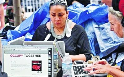 一些示威者在祖科蒂公園使用電腦上網(wǎng)。