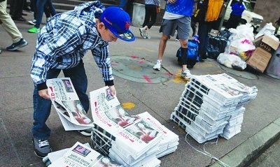 示威者認(rèn)為主流媒體對(duì)他們的報(bào)道存在誤導(dǎo),于是自行籌款出版《占領(lǐng)華爾街日?qǐng)?bào)》,上周六開始印刷5萬(wàn)份免費(fèi)派發(fā)。