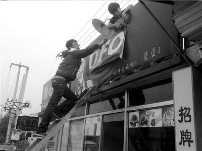 昨天下午,記者再次來到這家小餐館,店主之一朱寶來正在梯子上換招牌,將“OFC”換成了“UFO”?!拔乙埠ε氯巧瞎偎尽!敝鞂殎硖寡裕约合騺硐矚g設(shè)計(jì),奧巴馬的頭像和“OFC”的名稱,他只是覺得挺有創(chuàng)意,并沒想很多,然而被英國(guó)《每日郵報(bào)》報(bào)道后,引起國(guó)內(nèi)多家媒體的關(guān)注。對(duì)于是否侵權(quán),他這幾天去咨詢了相關(guān)的機(jī)構(gòu)和人士,但都沒有得到一個(gè)肯定的答案,于是干脆將原來的店名換掉。