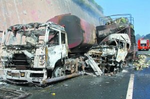 搶險人員抵達現(xiàn)場時發(fā)現(xiàn),事故路段黑煙滾滾,其間夾雜著烈火,煙火交織在一起高達6米多。在烈焰中央,一輛大型槽罐車被另一輛大貨車頂在槽罐處推向路肩的護坡上,滿載著甲醇的槽罐車被撞得變形泄漏?;饒鲋羞€不時傳來“噼啪”爆響,路面上飛濺著許多燒毀的機械碎片和燒焦的貨物,空氣中彌漫著一股難聞的燒焦的塑膠制品氣味。