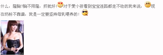 “什么,隆胸?胸不用隆,擠就好!對(duì)于愛小孩看到寶寶連路都走不動(dòng)的我來說,現(xiàn)在奶粉不靠譜,我是一定要堅(jiān)持母乳喂養(yǎng)的!”
