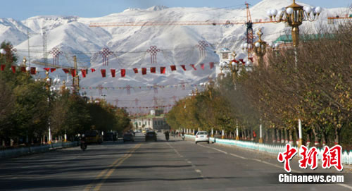 塔城地區(qū)和布克賽爾縣,市區(qū)晴空萬(wàn)里,山上白雪皚皚。陶拴科攝
