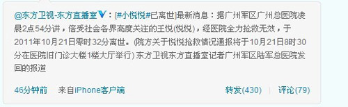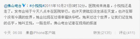 2011年10月21日0時(shí)32分。醫(yī)院傳來消息,佛山被碾壓女童小悅悅還是走了。發(fā)布會(huì)于10月21日8:30在醫(yī)院舉行。