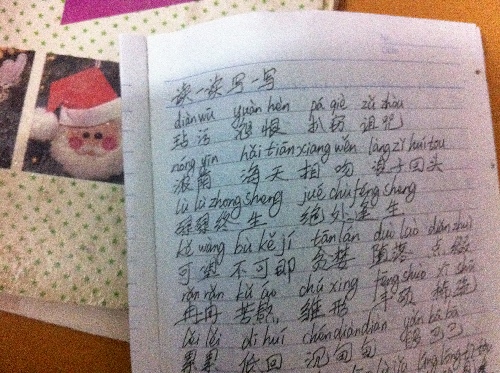 于東:我覺得有困難的是一些新學(xué)的字詞,比如“蹂躪”、“發(fā)髻”這些我不會(huì)寫,另外,有些雙韻母聲調(diào)應(yīng)該標(biāo)在哪個(gè)字母之上,我有的拿不準(zhǔn)。有些音是不是卷舌音,我也有出錯(cuò)現(xiàn)象??墒沁@樣全部抄寫一遍,全部都加上注音,已經(jīng)到了8點(diǎn)多,我還有數(shù)學(xué)、歷史作業(yè)沒有做完呢。