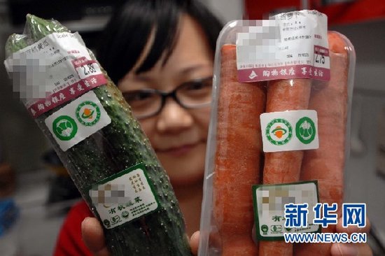 濟(jì)南一位市民在超市購(gòu)買(mǎi)的每公斤18元的有機(jī)黃瓜和每公斤9元的胡蘿卜。新華記者郭緒雷攝
