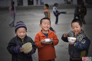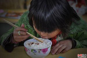 鳳凰縣山江鎮(zhèn)完小下課鈴聲響起,一群小學(xué)生飛奔食堂抱起一大桶米飯,到各個班上分吃午飯。四年級的一間教室里,一些學(xué)生紛紛掏出自己從家里帶來的罐子菜送飯。盡管大部分學(xué)生碗里都是一些剁辣椒,辣椒醬之類的菜,這群小學(xué)生還是吃的很開心。據(jù)完小的老師說,這些四年級的學(xué)生是學(xué)校的寄宿生,按學(xué)校的規(guī)定,每人一個星期交12斤大米,學(xué)校負(fù)責(zé)將米煮熟,不限量供應(yīng)。很多學(xué)生交不起學(xué)校食堂1元一餐的菜錢,自己從家里帶來了一個星期一日三餐都要吃的罐子菜。