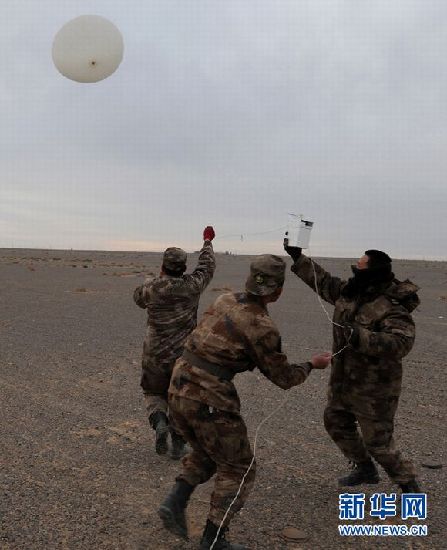 ????氣象分隊在呼嘯的大風中實施“放球”作業(yè),確保氣象探測數(shù)據(jù)的及時和準確。