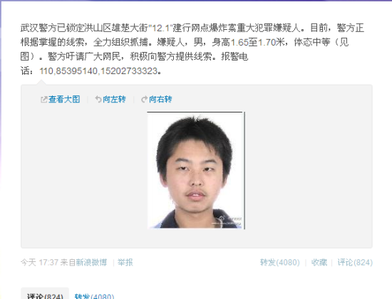 武漢警方官方微博公布正面照 全警全城大搜捕
