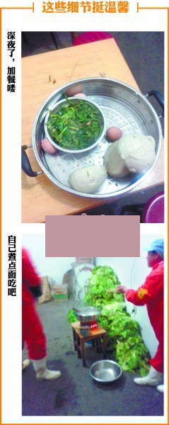 記者從晚上8時開始上班,幾乎一直在站著,干了三個多小時之后已經(jīng)是饑腸轆轆。晚上11時50分,黃師傅過來招呼記者,讓跟工人一起去食堂吃點(diǎn)飯?!霸蹅兺砩瞎茴D飯,你們吃點(diǎn)東西墊墊,要不然等會干活就餓了,也能歇歇腳?!?/p>