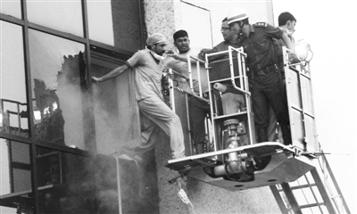 在云梯不足的情況下,許多消防隊員使用繩索和梯子徒手攀爬上醫(yī)院大樓,然后打破窗戶進入室內(nèi)進行營救。