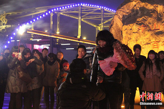 12月24日是西方傳統(tǒng)節(jié)日平安夜,在蘭州黃河岸邊,寒風(fēng)刺骨,一男青年在朋友的幫助下向女友浪漫求婚,引得路人駐足圍觀。張道正 攝