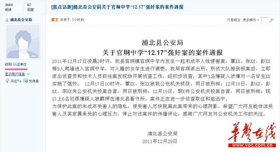 浦北縣公安局通報 網(wǎng)絡(luò)截圖。 其中一人遭輪奸 校方無人到場制止 9人涉案 12月28日,一位網(wǎng)友發(fā)帖爆料,稱17日凌晨,10名社會青年竄入廣西通北縣官垌中學(xué),將正在宿舍熟睡的數(shù)十名女生猥褻,其中一名女生因強(qiáng)烈反抗遭3人輪奸。 【爆料】 女生在宿舍被猥褻輪奸 網(wǎng)帖稱,17日凌晨,10名社會青年躥入廣西通北縣官垌中學(xué)女生宿舍,將30名熟睡中的女初中生猥褻,后來因女生不斷大聲呼救,便逃離了現(xiàn)場。在逃離途中,“這群青年發(fā)現(xiàn)無人追捕他們,竟再次潛入女生宿舍”。30名驚魂未定的女生再次被猥褻,其中一名女生因強(qiáng)烈反抗,被3人輪奸。 發(fā)帖網(wǎng)友“qq1234qwe”質(zhì)疑,學(xué)生被猥褻、輪奸長達(dá)兩個小時,面對學(xué)生們的大聲呼救,為何校方無一人前往現(xiàn)場? 【調(diào)查】 女生遭猥褻一事屬實 如此重大的校園安全事故,為何沒有任何動靜?這條網(wǎng)帖會不會是謠言? 12月29日下午,華聲記者與浦北縣公安局取得聯(lián)系。該局趙警官告訴記者,官垌中學(xué)女生遭猥褻一事屬實,但涉案人數(shù)是9人。 趙警官提供的案件通報顯示,2011年12月17日凌晨2時許,浦北縣官垌鎮(zhèn)官垌中學(xué)內(nèi)發(fā)生一起未成年人性侵害案,覃某、張某、彭某等9人爬墻進(jìn)入官垌中學(xué),對入睡的女學(xué)生進(jìn)行猥褻,其中3名嫌疑人涉嫌對一名學(xué)生實施了強(qiáng)奸。 據(jù)悉,2名犯罪嫌疑人17日當(dāng)天被抓捕刑拘,另有4名犯罪嫌疑人先后投案自首,目前案件正在進(jìn)一步偵查取證和追逃中。 截至發(fā)稿前,記者未能聯(lián)系上官垌中學(xué)負(fù)責(zé)人。(記者 羅浩) |